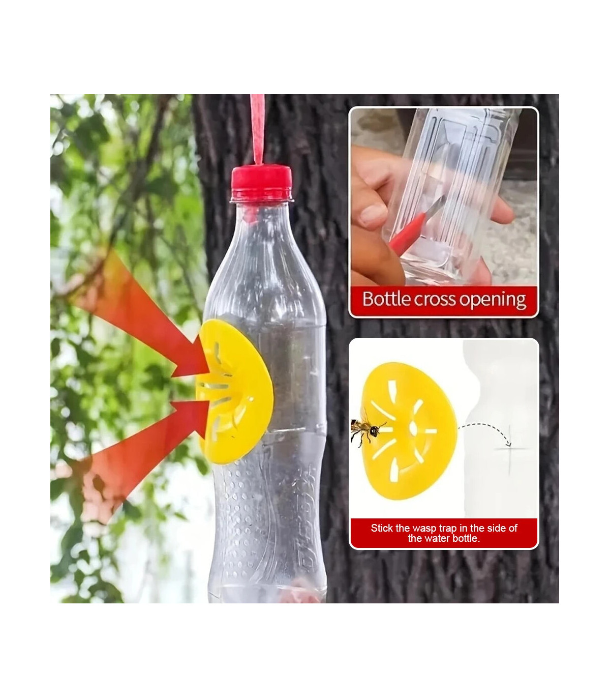 2. Fácil de usar:Convierte una botella de cualquier tamaño en una trampa efectiva con nuestro embudo para insectos voladores. Simplemente coloca la trampa en el costado de una botella de agua y una vez que los insectos entren, no podrán escapar, reduciendo eficazmente la presencia de avispas y asegurando un entorno exterior más agradable.